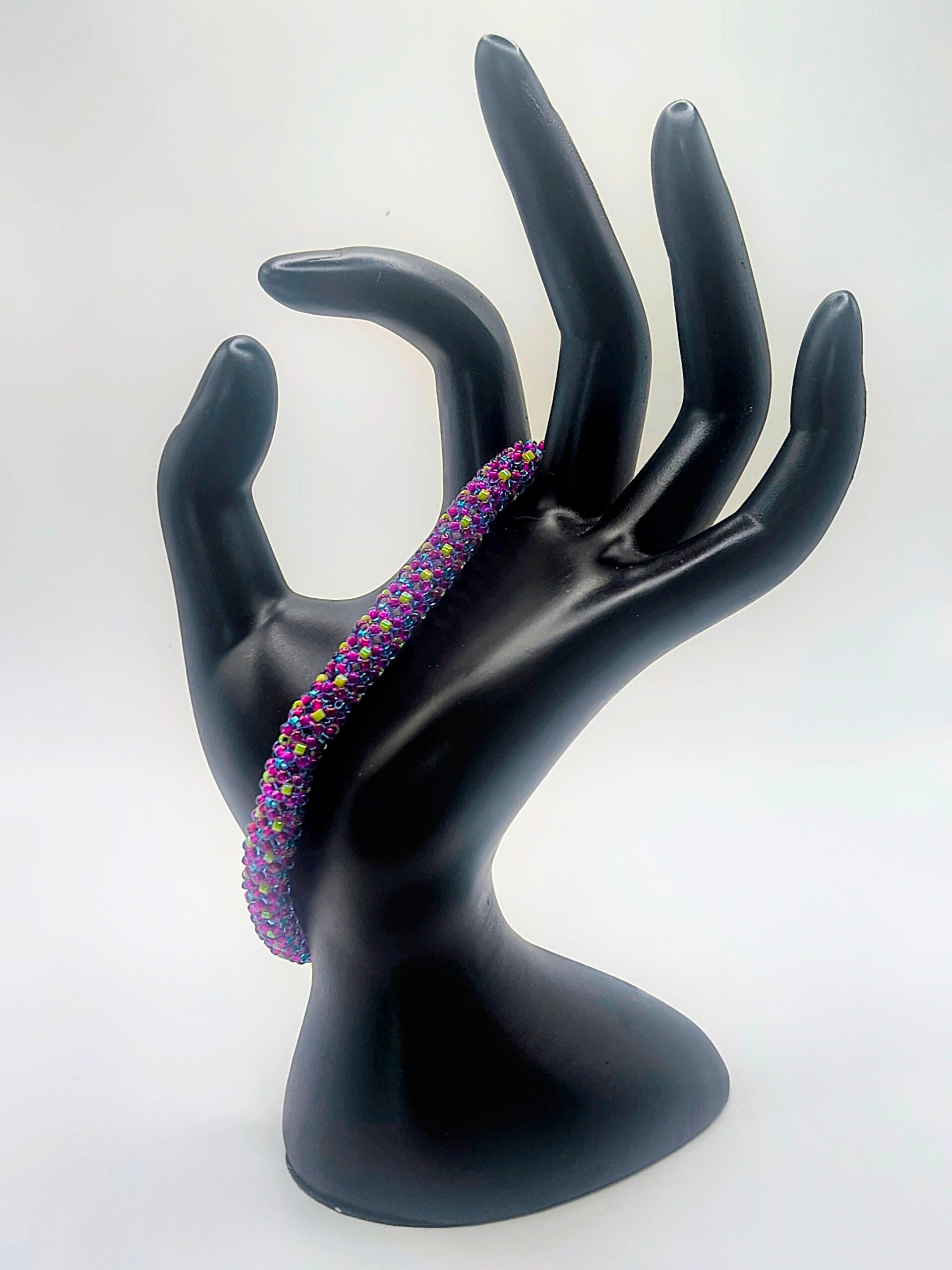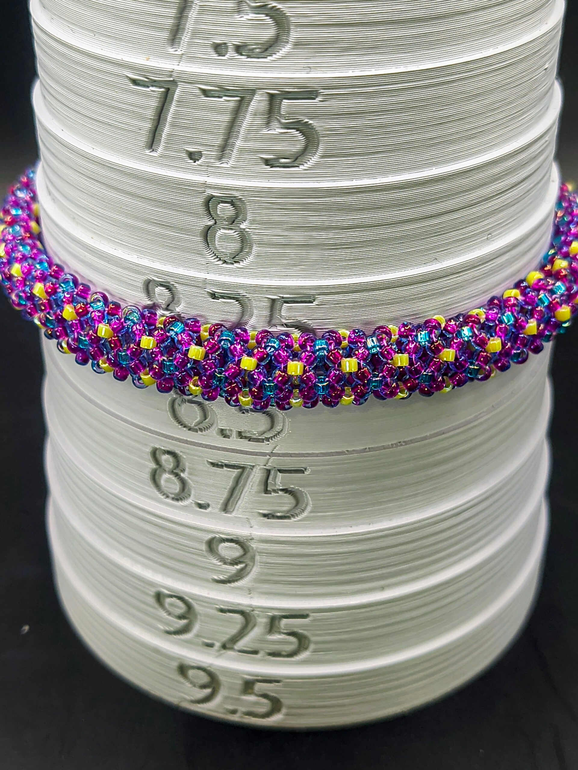 The primary color is purple with accent beads in chartreuse and blue. The picture on the sizing mandrel appears more pink than purple.