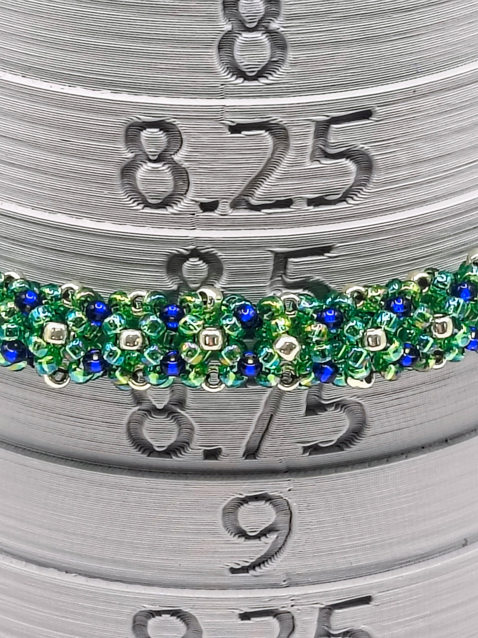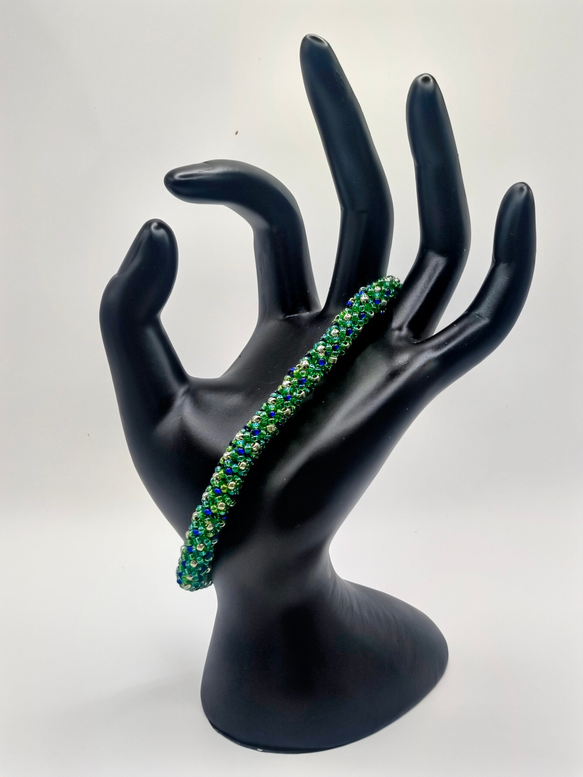 The primary color is kelly green with accent beads in silver and blue.