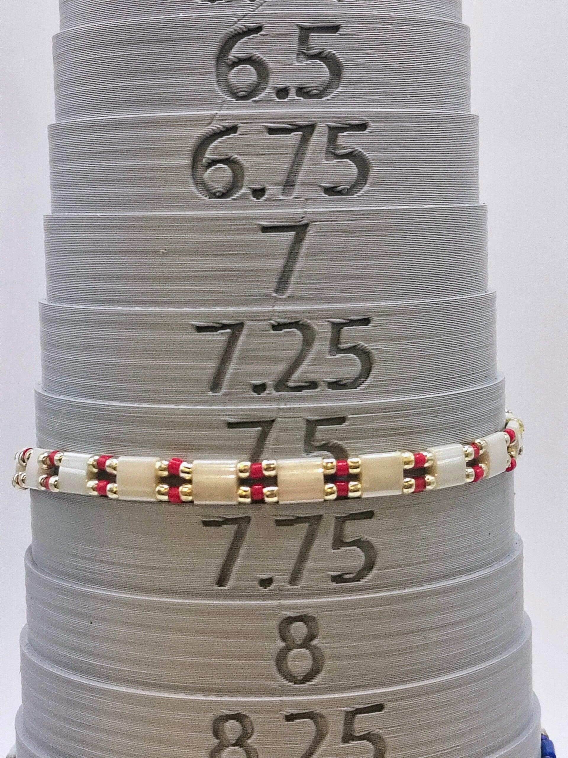 This bracelet is made with high quality Miyuki Tila beads in whiteand white with size 15 beeds in red and silver. They are strung on a strong filament thread similar to fishing line and feature a magnetic closure with safety chain.